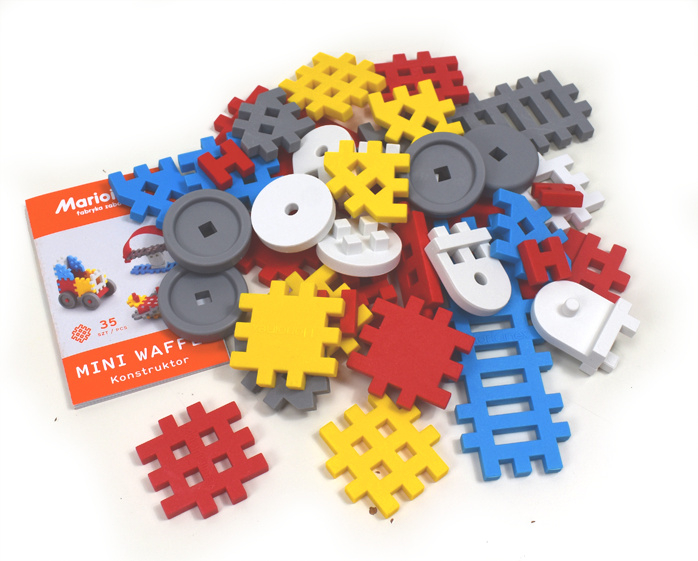 De basiselementen zijn kleurrijke wafels van flexibel kunststof die je in elkaar steekt. Dat gaat heel gemakkelijk, maar zit echt stevig. Je kan er dan ook echt prachtige (en grote) bouwwerken mee maken. Helemaal in combinatie met de extra elementen zoals wielen met assen, daken en kartonnen thema figuurtjes.