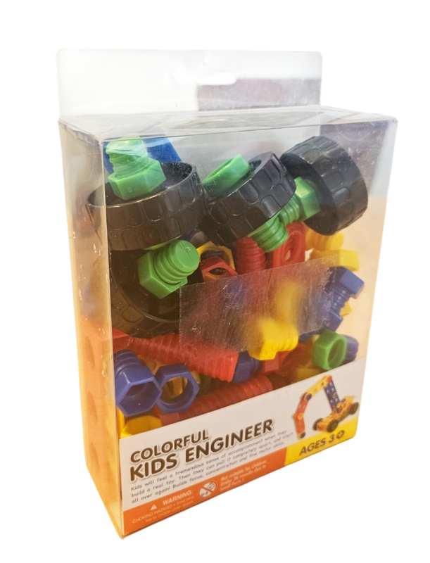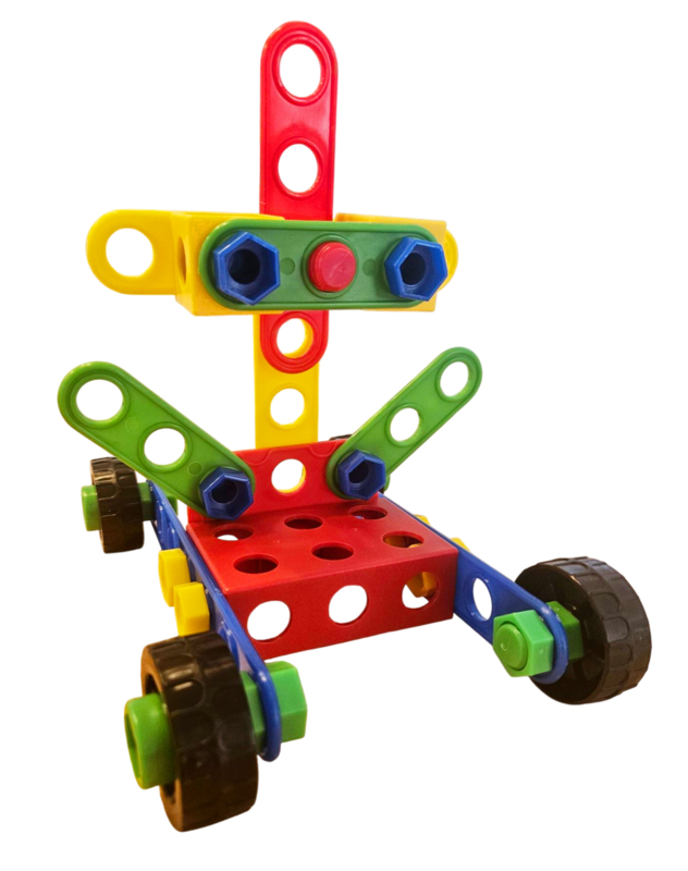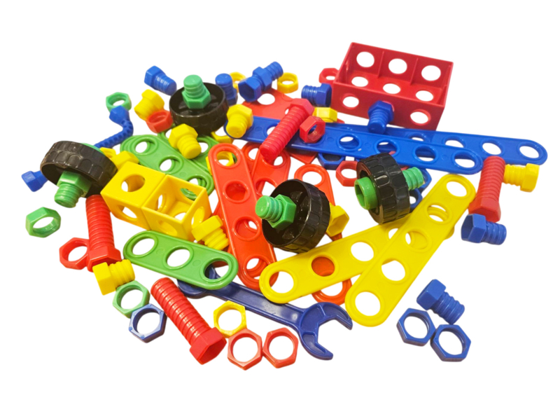 De set bestaat uit verschillende maten plankjes, 2 maten 3D onderdelen, 3 verschillende maten bouten en moeren en 4 wielen. En daarnaast 2 stuks gereedschap om de bouten en moeren goed vast te draaien (kan ook met je handen, maar is leuker met gereedschap).