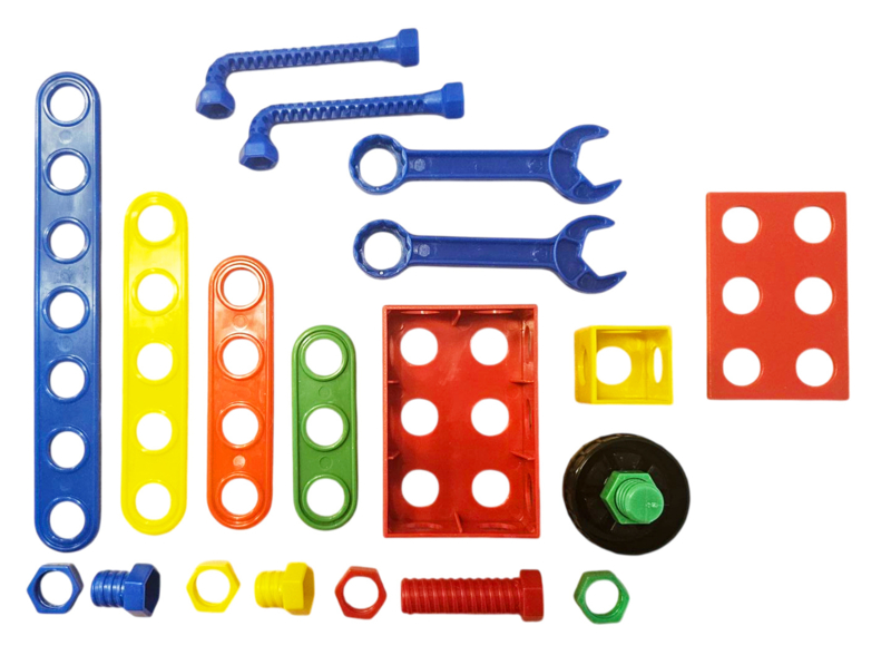 De set bestaat uit verschillende maten plankjes, 2 maten 3D onderdelen, 3 verschillende maten bouten en moeren en 12 wielen. En daarnaast 4 stuks gereedschap om de bouten en moeren goed vast te draaien (kan ook met je handen, maar is leuker met gereedschap).