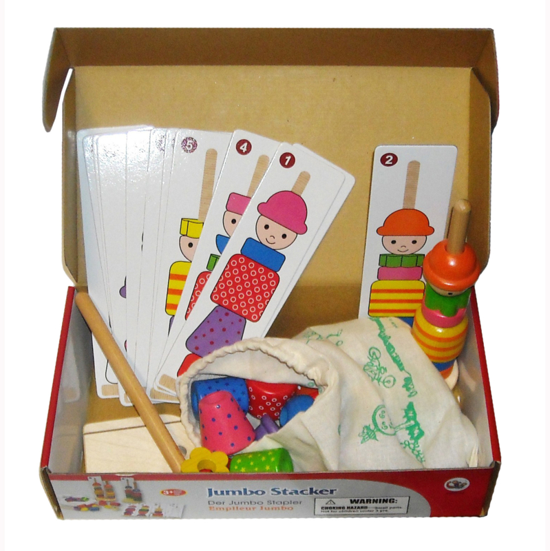 Aan de hand van voorbeeldkaarten stapel je de mensjes in de juiste volgorde. De set bestaat uit twee basisplankjes met stokjes ca. 20 cm hoog, 27 blokjes en 12 voorbeeldkaarten. Inclusief een katoenen opbergzak.
