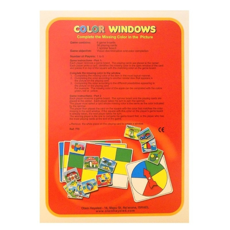 Dit spel bestaat uit 6 basiskaarten met alle kleuren, een draaischijf en een heleboel kleine kaartjes met voorwerpen erop.