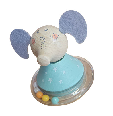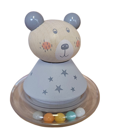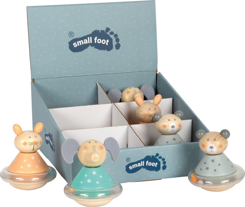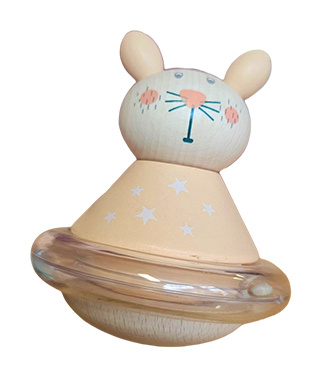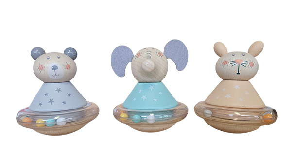 OverzichtHouten beestje met bolle onderkant waardoor hij vrolijk heen en weer wiebelt.