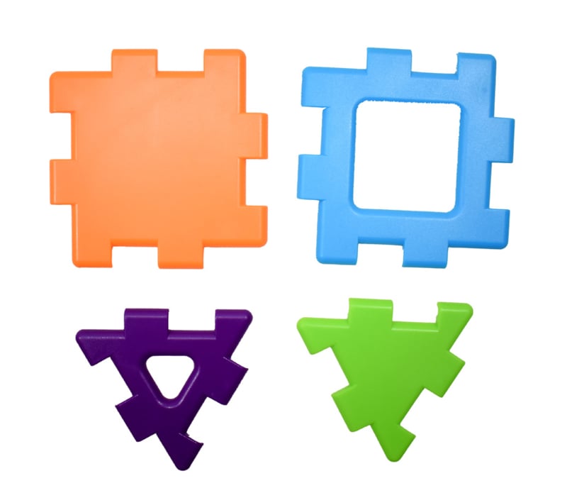 In een set zitten 40 polydron onderdelen: 20 vierkanten en 20 driehoeken.
