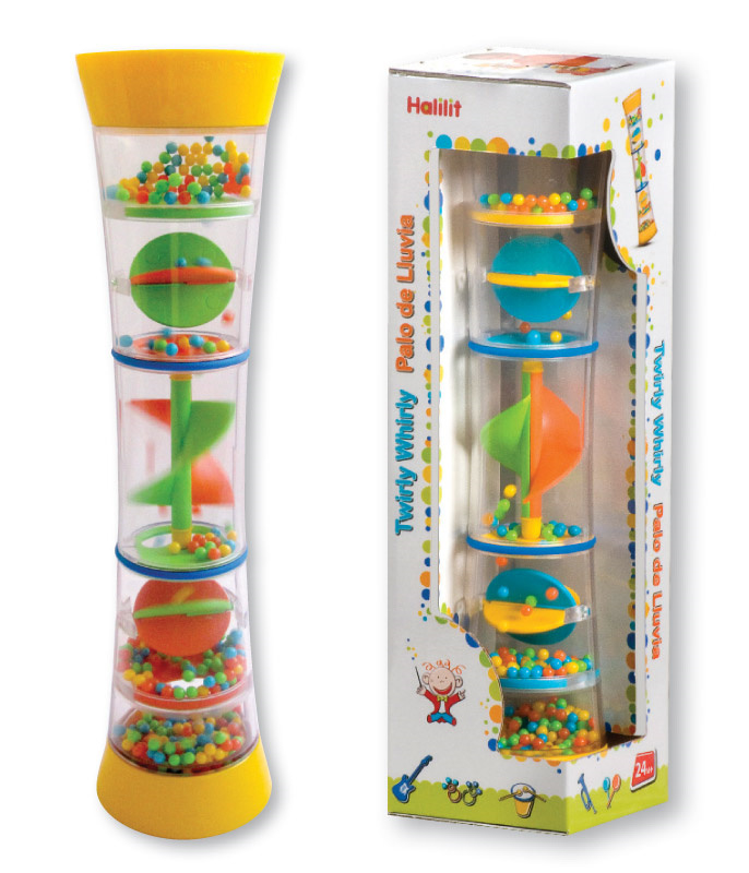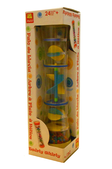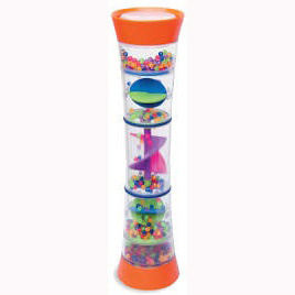 Regenmaker met niet alleen vallende kraaltjes, maar ook bewegende schoepen die gaan draaien als de kraaltjes er doorheen vallen.