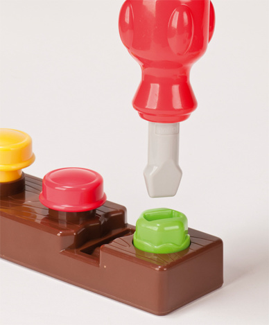 De spijkers en schroef zitten vast in het plankje en kunnen er niet uit. Dus geen kleine onderdelen die gevaarlijk zijn en die makkelijk kwijt raken.
