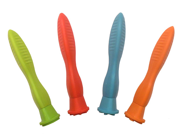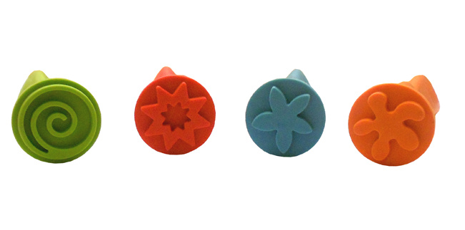 OverzichtSet van 4 lange rubberen stempels die door hun lange steel heel goed vast te pakken zijn.