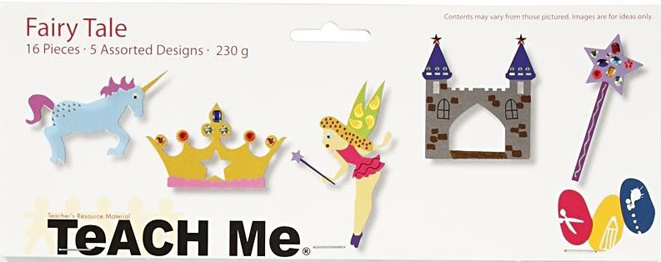 Kartonnen figuren in de vorm van een kroon, een kasteel, een eenhoorn, een toverstaf en een elfje.