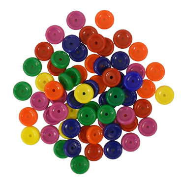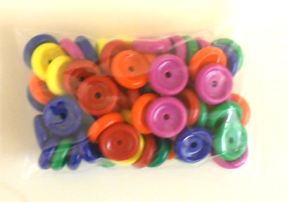 Zak met een heleboel dikke kunststof rondjes in vrolijke kleurtjes voor bij de hamertje tik.