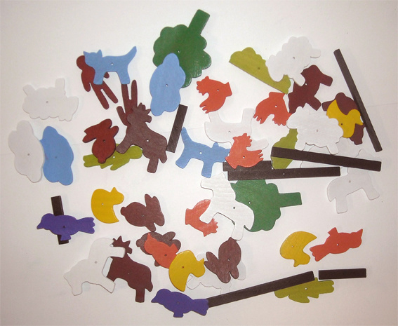 Zak met ongeveer 35 houten hamertje tik figuurtjes in het thema boerderij.