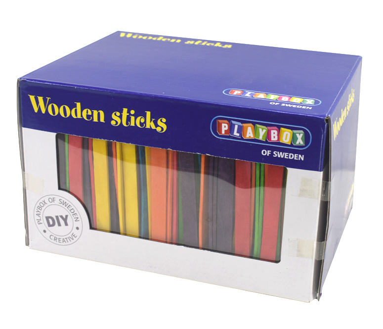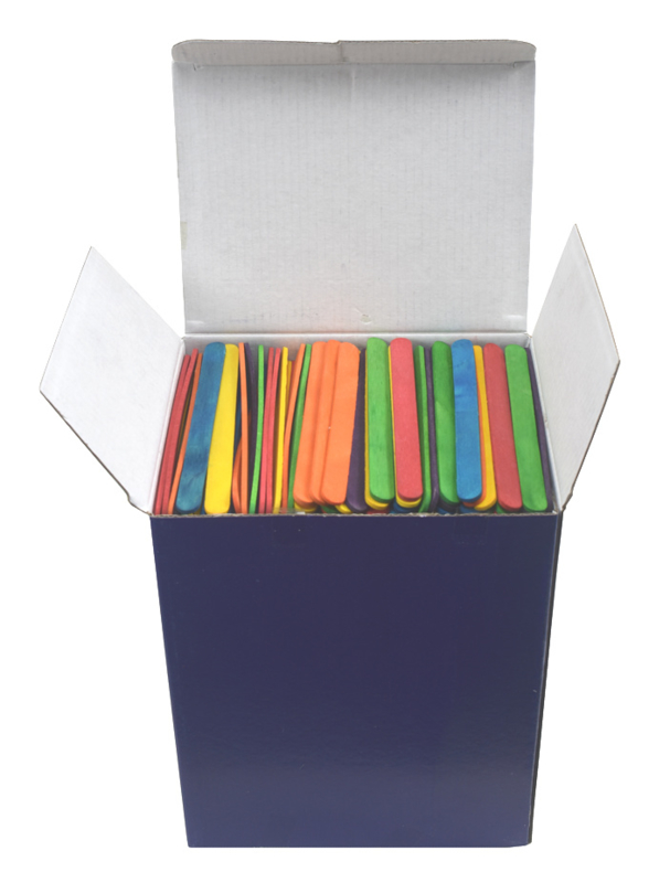 OverzichtDoos met 1000 gekleurde ijsstokjes.