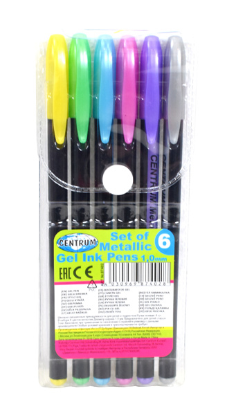 OverzichtPakje met 6 metallic gelpennen.