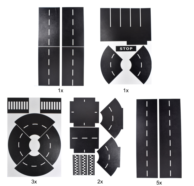 In het pakket zitten maarliefst 12 grote vellen met daarop allemaal stukken autobaan. Maar niet alleen maar rechte weg, maar ook bochten, rotondes, zebrapaden en een parkeerplaats.