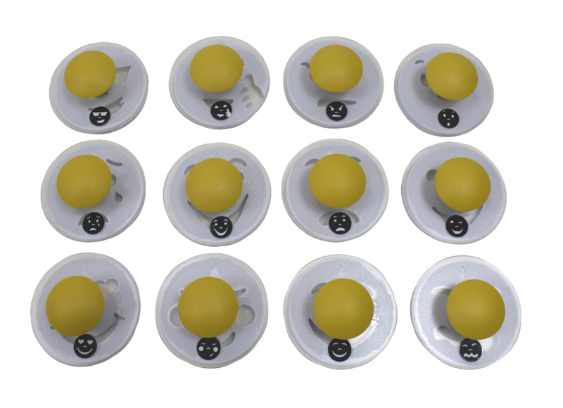 Elke stempel heeft een gezichtje met een andere, duidelijk herkenbare emotie.
