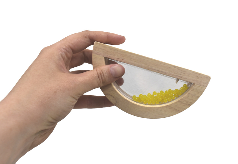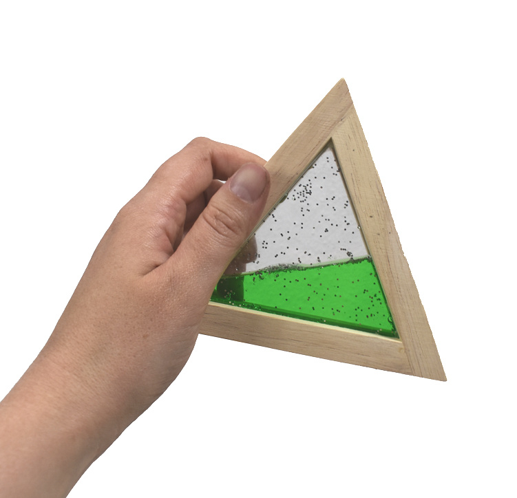 Wat gebeurd er als je de blokken omdraait; het zand verschuift, de kraaltjes rammelen en de gekleurde vloeistof met glitters erin maken helemaal een prachtige show.