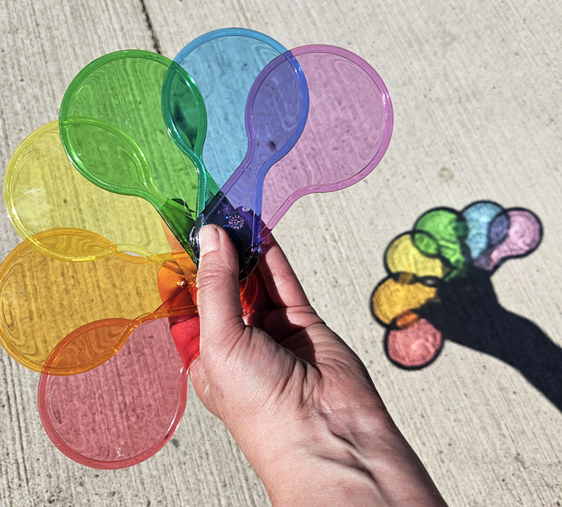 Op de laatste 3 foto's zie je wat er gebeurd als je de kleurenpeddels boven een vlakke ondergrond houdt als de zon erdoor schijnt. De kleuren zijn zo fel dat je ze echt weerspiegeld ziet op de ondergrond. Echt een hele leuke activiteit! Toen we deze foto's aan het maken waren (gewoon bij ons voor het magazijn in de speeltuin) kregen we zulke leuke reacties en enthousiaste kinderen om ons heen... Dikke aanrader!