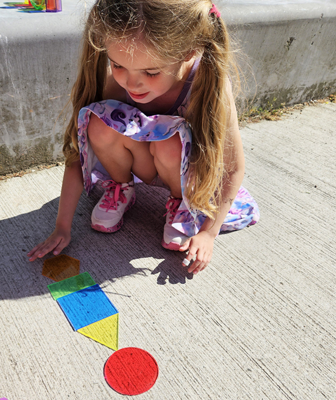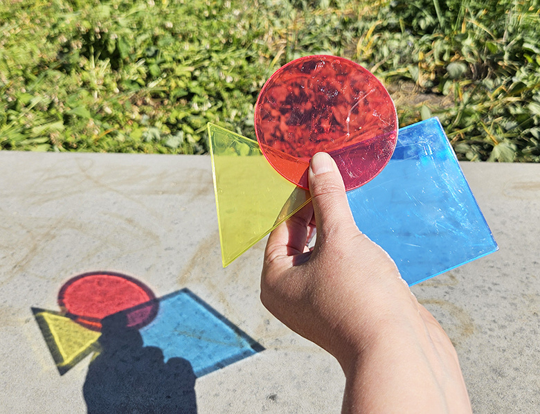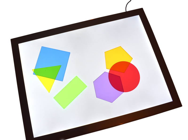Het zijn transparante figuren. Je kan er dus doorheen kijken maar je kan ze ook over elkaar schuiven. Rood en geel over elkaar heen wordt samen oranje... Dat zie je extra goed als je ze op een lichttafel of lightpad legt.