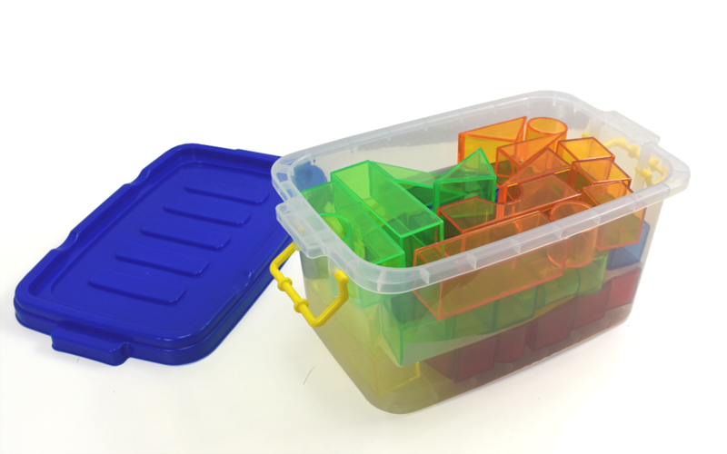 De blokken zijn gemaakt van transparant plastic in 5 verschillende kleuren.