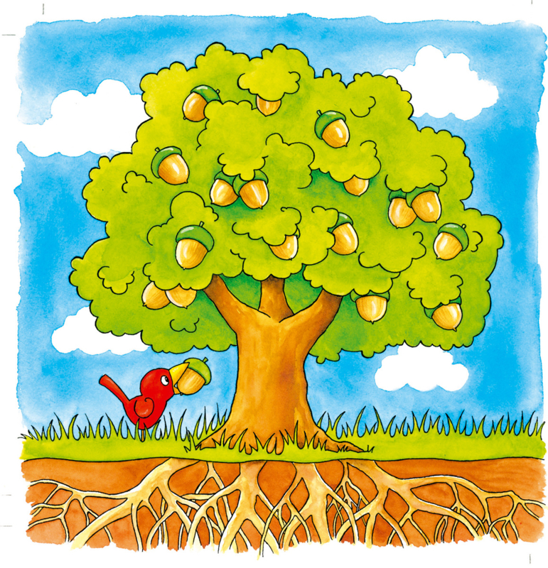 OverzichtDeze puzzel laat je in 4 lagen zien hoe een eikenboom groeit. Op de onderste laag stopt een vogel een eikel in de grond. Dan gaat de eikel uitlopen en groeien en tenslotte hebben we een complete eikenboom.