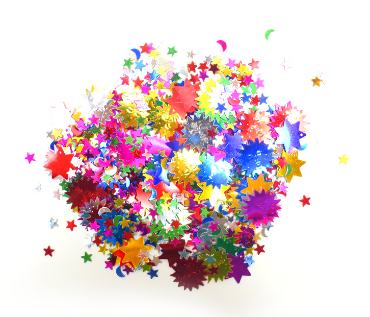 Zakje met ongeveer 10 gram pailletten in de vorm van sterretjes aangevuld met grote zonnetjes en kleine maantjes.