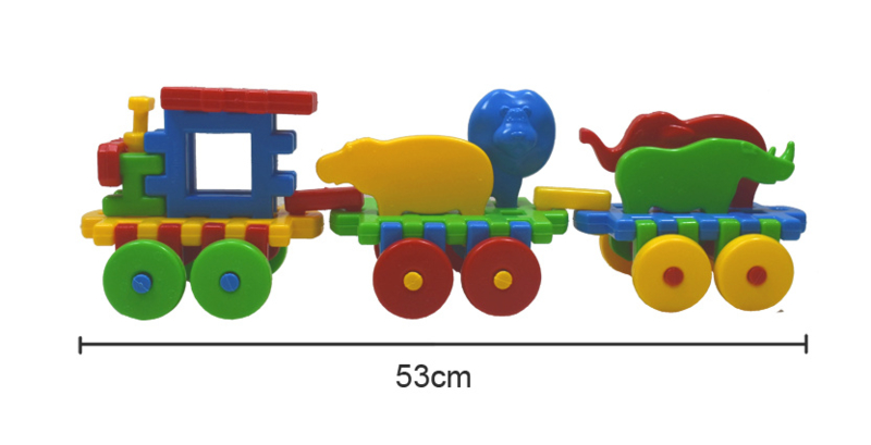 De trein bestaat uit een lokomotief met 2 wagonnen. Op beide wagonnen staan beestjes; 4 in totaal.