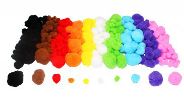 OverzichtGrote zak met zachte pompom balletjes in veel verschillende kleuren en verschillende maten.