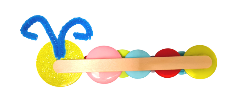 Van de pijpenrager knip je een stukje af van ongeveer 8cm. Dat vouw je in2en en de uiteinden buig je om. Dat zet je bij het puntje vast aan de achterkant van het hoofd. Nu is je rups klaar.