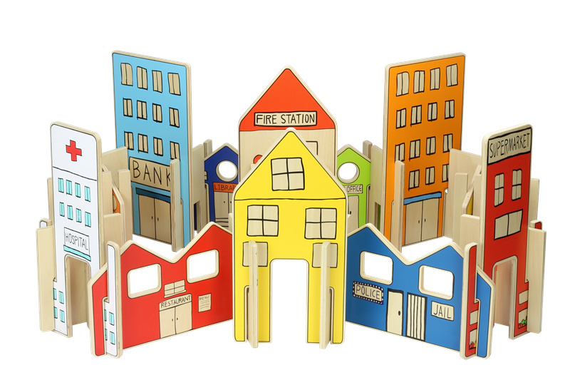De happy architect stad bestaat uit 26 panelen die je in elkaar kan schuiven. Zo maak je een straat, een stad, of allemaal losse gebouwen.