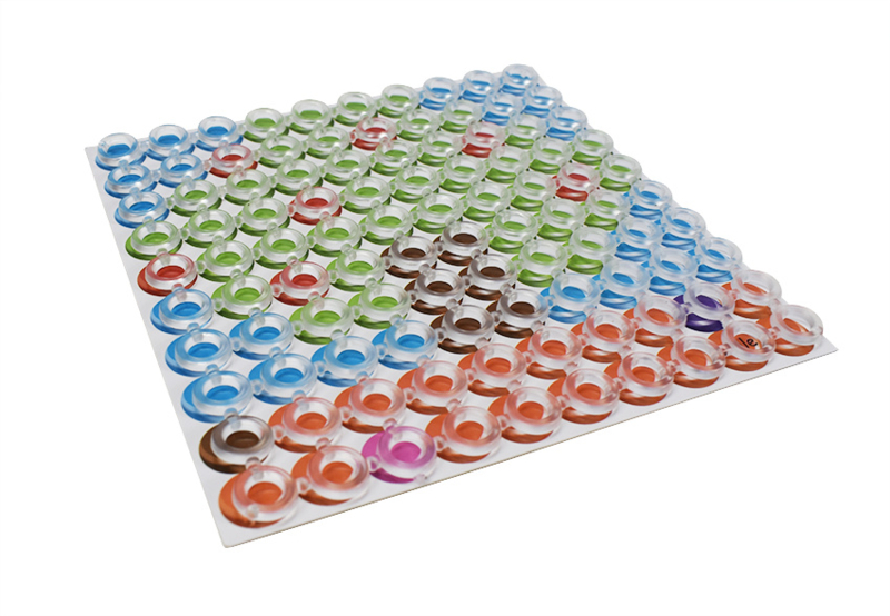 De set bestaat uit een bak met wel 500 ronde mozaieknoppen, 12 dubbelzijdige voorbeeldkaarten en een flexibel matje om de noppen in te prikken.