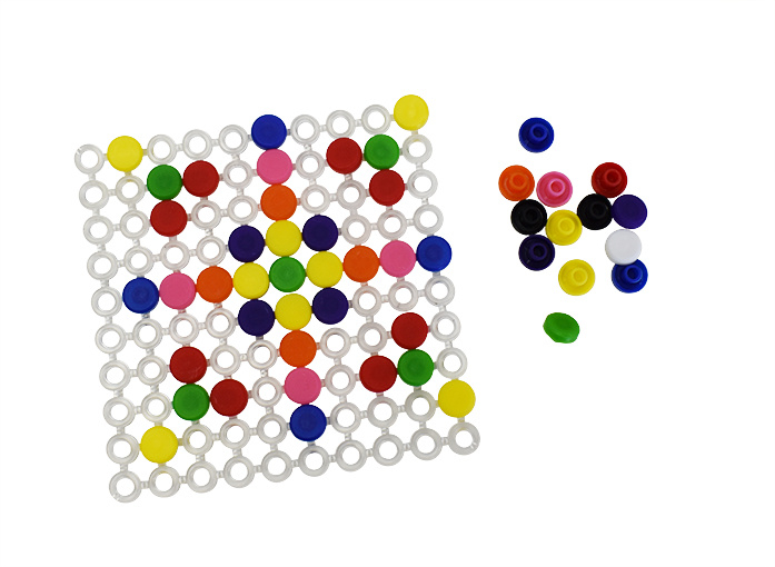- Als je het wat moeilijker wilt maken leg je het voorbeeld op tafel en het matje op het deksel van de bak. Omdat het voorbeeld er dan niet racht onder ligt moet je heel goed kijken en tellen waar de gekleurde noppen precies moeten.