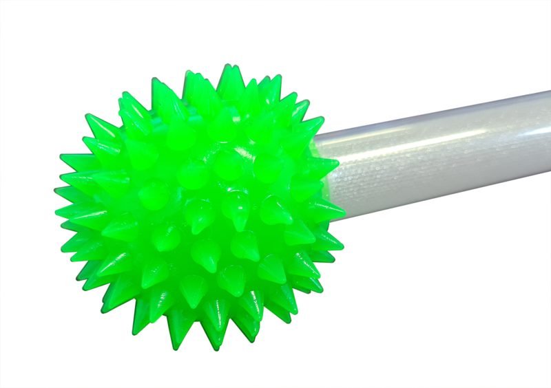De baton is handzaam, ook voor kleine kinderen. En de stekelbal is niet hard.