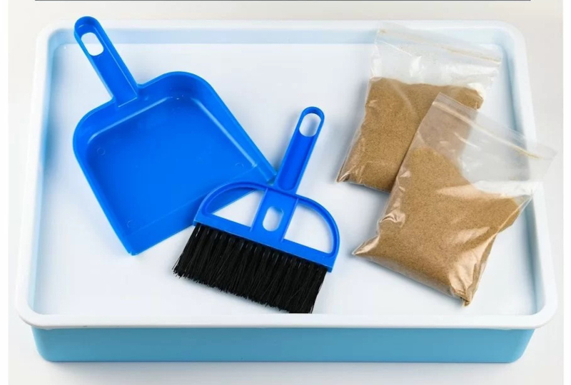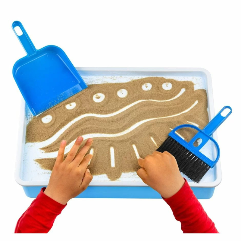 De bak wordt geleverd inclusief 2 zakjes fijn zand. Dat is geen speelzand zoals kinetic, maar echt fijn (zandbak)zand. Ook zit er een stoffer en blik bij.