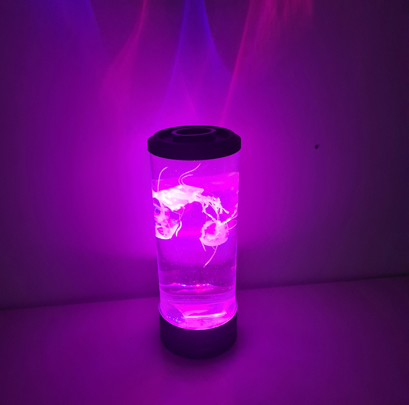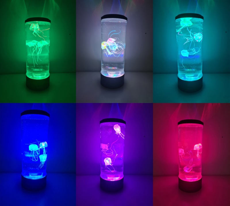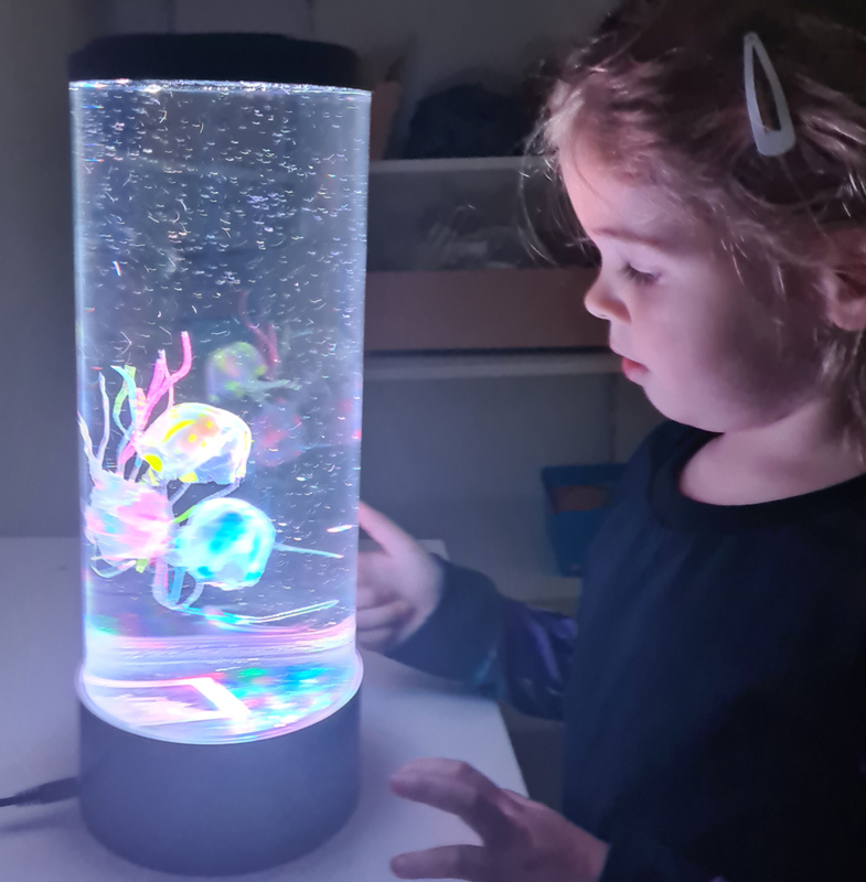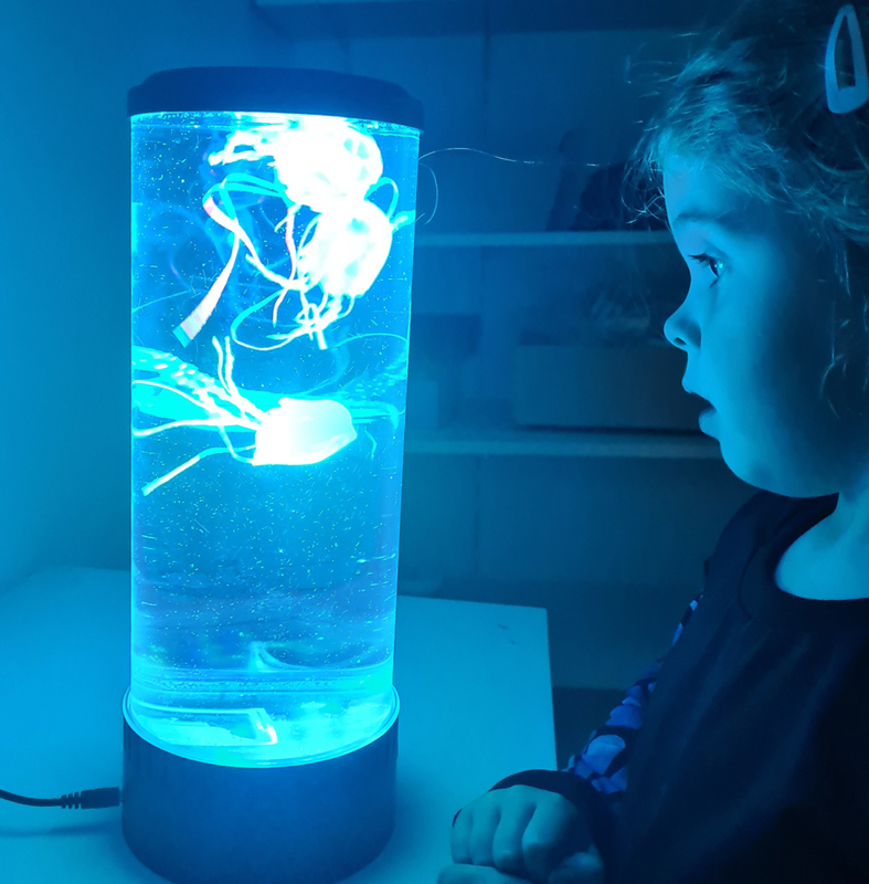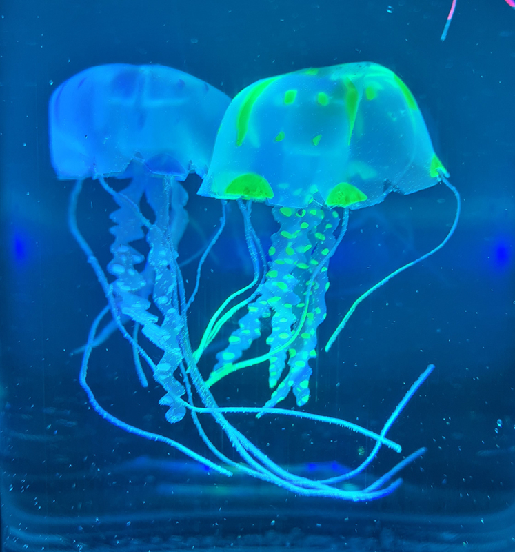 In dit ronde aquarium zwemmen 3 (namaak) kwallen met lange, wiebelend pootjes die alle kanten op bewegen. De kwalletjes hebben alledrie een andere kleur die neon oplicht in het LEDlicht dat van onderaf op ze schijnt.