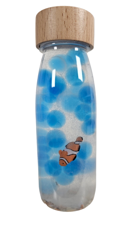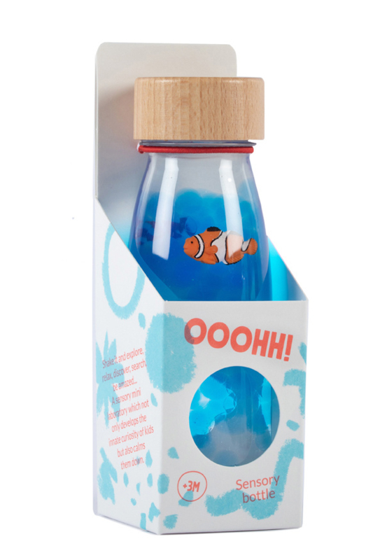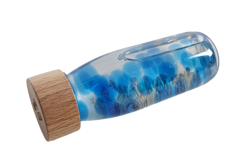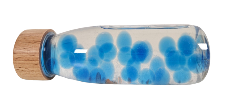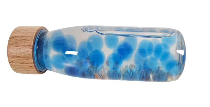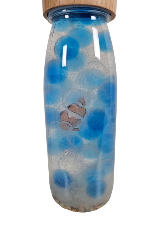 OverzichtDeze senso fles is gevuld met vloeistof met daarin witte (doorzichtige) en blauwe waterparels, kleine steentjes en een visje. Het is dus net een mini aquarium. Als je de fles ondersteboven houd wil het visje naar beneden, maar doordat het water vol zit met waterparels gaat dat niet zo snel en is het net alsof het visje echt zwemt.