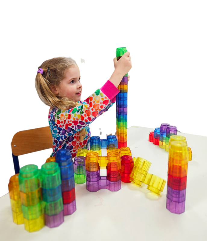 Doordat de blokken transparant zijn kan je er ook heel leuk mee bouwen op een lightpad.
