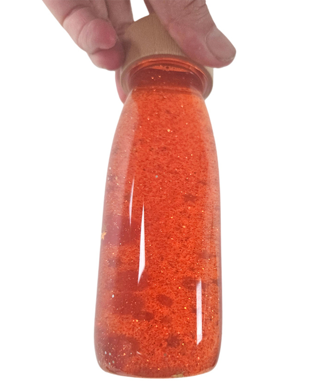 Deze senso flessen zijn gevuld met gekleurde vloeistof, glitters en pompom balletjes. Als je de fles schud gaan alle glitters door elkaar dansen en heb je een glitterstorm in een flesje. De pompoms rollen heen en weer en zorgen voor nog meer effect.
