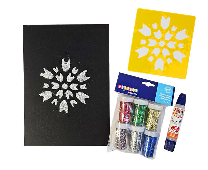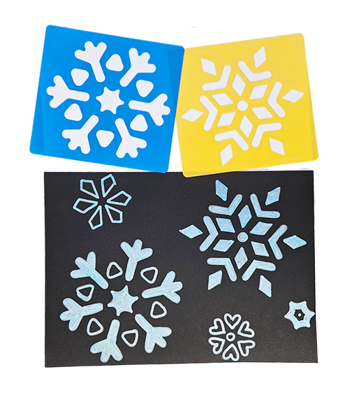 Een setje van 6 verschillende sneeuwvlokken. Op de foto's zie je al wat verschillende voorbeelden die ik gemaakt heb: eentje met strooiglitter, eentje met 1 kleur metallic stift op zwart karton en eentje met metallic stift op zwart karton waar ik zelf nog verder ben gegaan en de sneeuwvlok nog mooier heb gemaakt met extra vormpjes en kleurtjes.