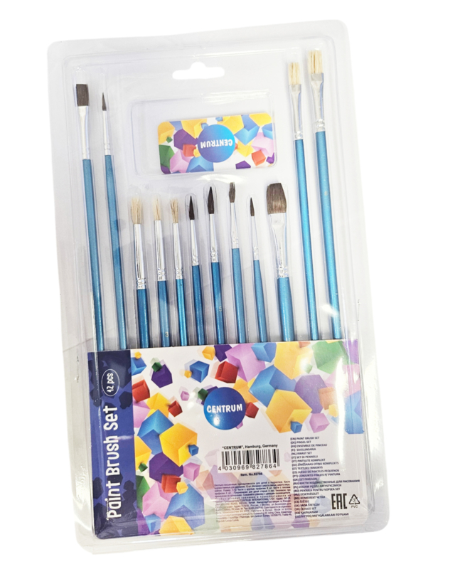 OverzichtSetje met een assortiment aan ronde en rechte penselen van verschillende diktes.