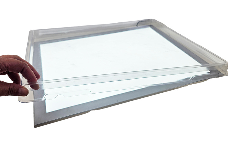 Deze kunststof bak valt over de lightpad heen waardoor hij perfect op zijn plek blijft. En door de hoge randen creeer je een lage bak waar alles netjes in blijft: de losse onderdelen van de accessoires voor de lightpad, maar ook als je eens wilt werken met gekleurd zand of misschien wel met scheerschuim. Hartstikke handig! En supermakkelijk schoon te maken.