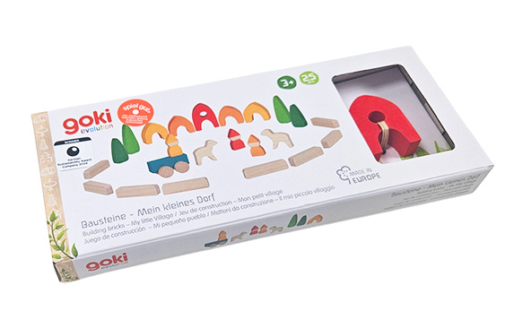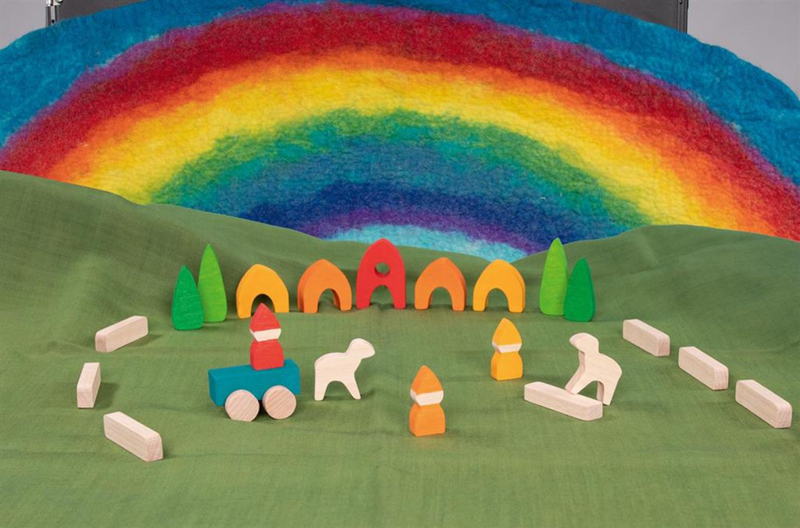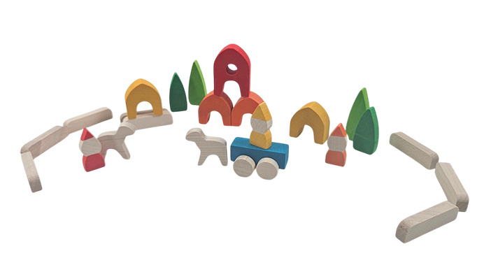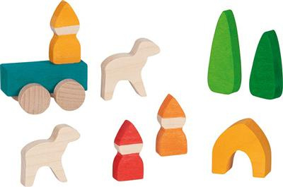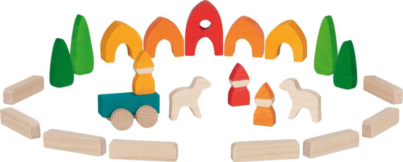 Houten speelset met huisjes, poppetjes (kabouters) boompjes, hekjes, beestjes en en een kar.