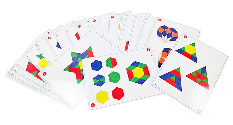 Alle standaard mozaiek bestaat uit dezelfde vormen en vaak ook dezelfde kleuren (al zijn de kleuren soms anders); groene driehoeken, oranje vierkanten, blauwe ruiten... En deze voorbeeldkaarten sluiten daar perfect op aan.