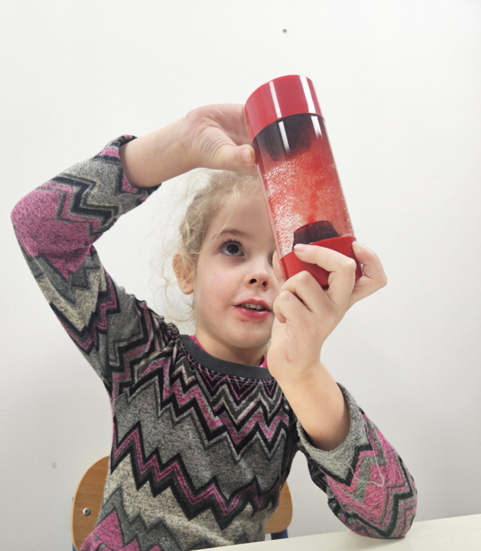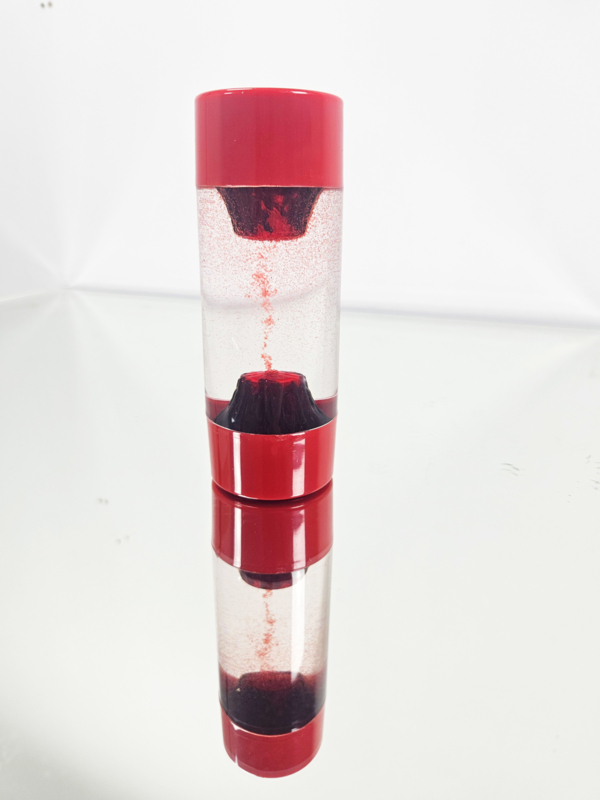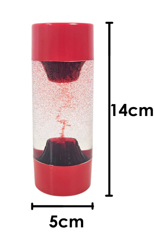 Zowel onder als bovenin de cilinder zit een vulkaan dus als al het zand naar boven is gezweeft en je draait hem om dan heb je weer een nieuwe uitbarsting.