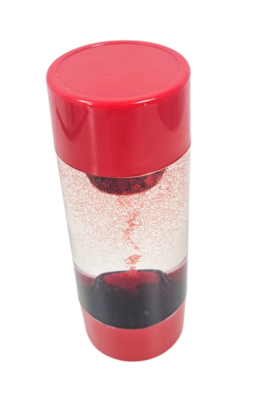 De cilinder is 14cm hoog en is gevuld met rood zand.