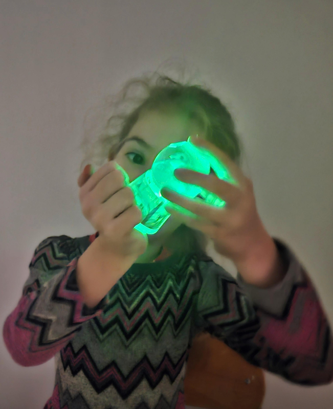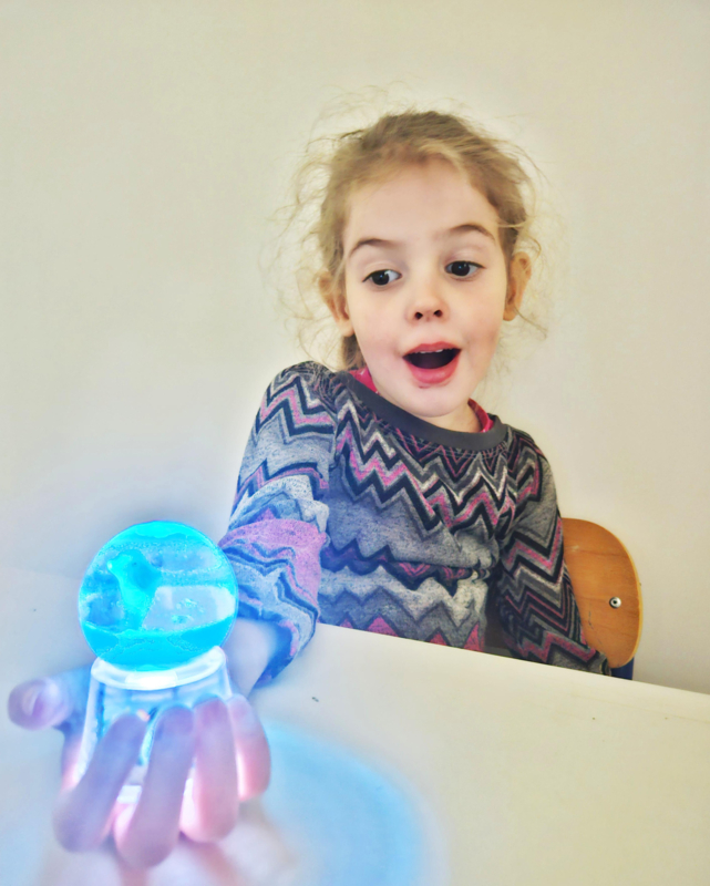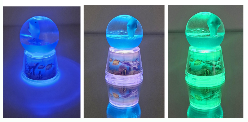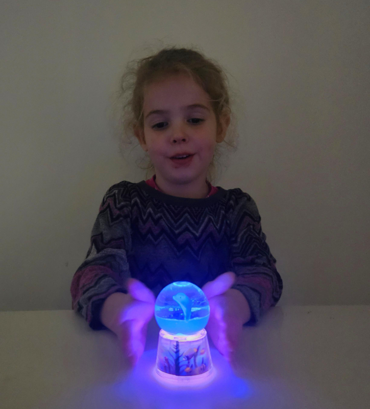 Zelfs zonder dat lichtje is hij al leuk. De vloeistof in de bol bestaat deels uit zware blauwe vloeistof en deels uit lichte, transparante vloeistof. daardoor blijft de blauwe vloeistof altijd onderop en is het net alsof de dolfijn uit het water springt. De staart van de dolfijn is verzwaard, dus hij blijf altijd rechtop.