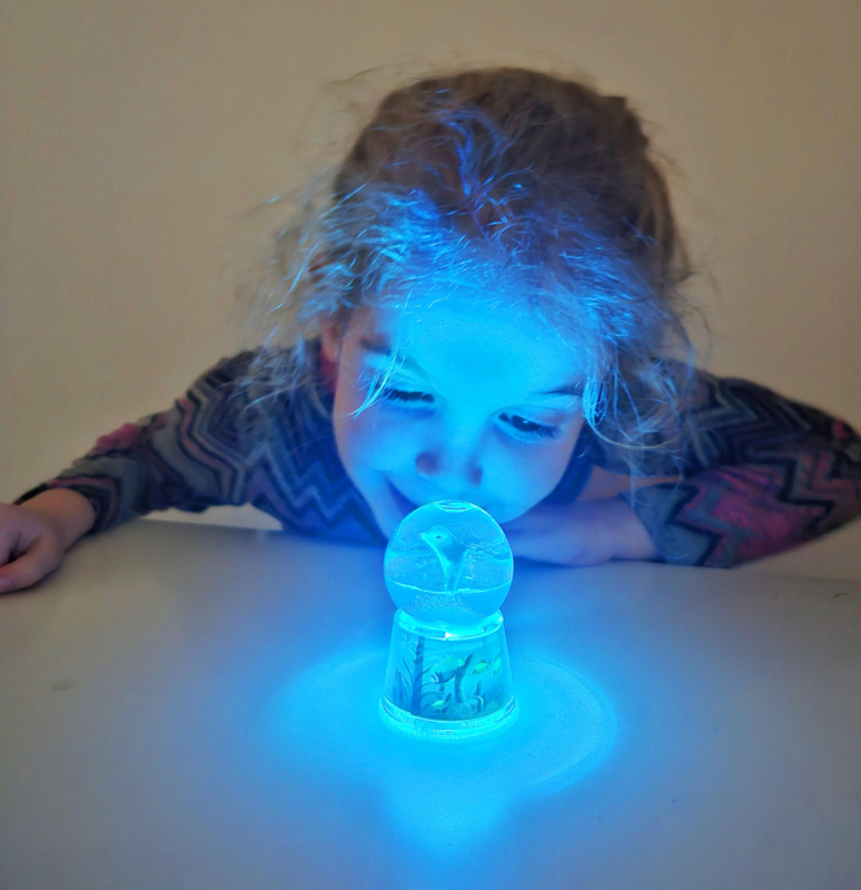 Aan de onderkant zit een schakelaartje waarmee je het LED licht aanzet om te zien hoe je schudbol verandert in een magische onderwaterwereld.