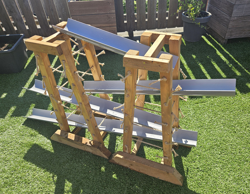 De set bestaat uit 2 robuuste houten torens. Deze zijn 80cm hoog en staan heel stabiel. Ze zijn aan alle vier de zijden bespannen met touwen waar je de goten in kan leggen. Bij de set zitten vier goten in verschillende lengtes.