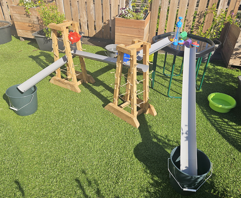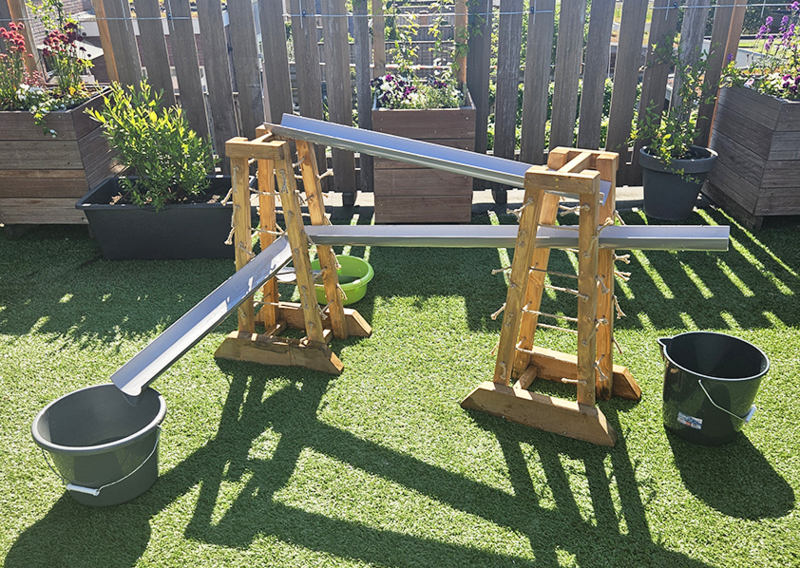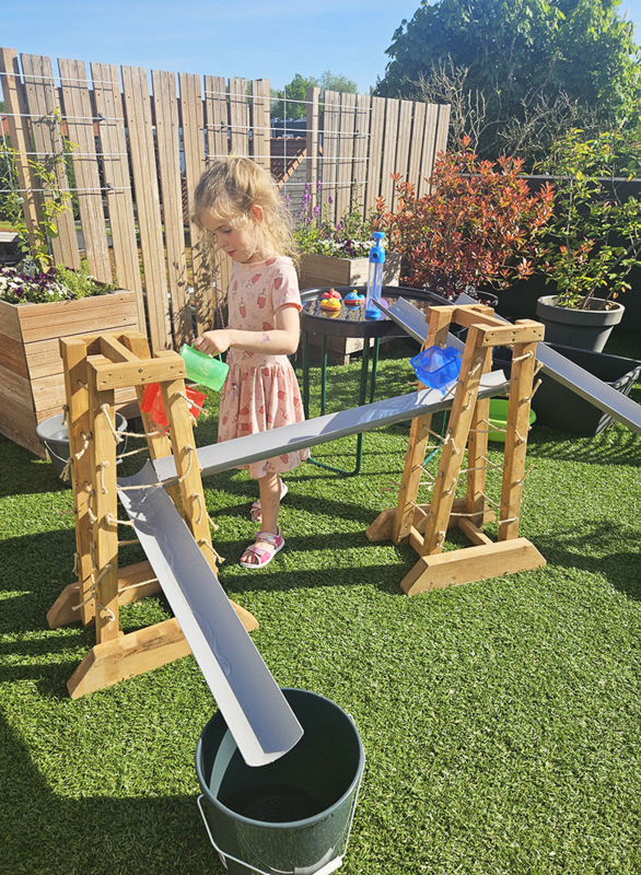 De goten zijn ook voor kinderen goed te hanteren. En het is geweldig om te zien hoe ze hun eigen baan bouwen. De eerste paar keer gaat het zeker mis, dan sluiten de goten niet goed op elkaar aan en gaat het water er aan alle kanten overheen. Maar met kleine veranderingen merk je dat ze er echt wel uit komen en zelf iets moois kunnen creëren.