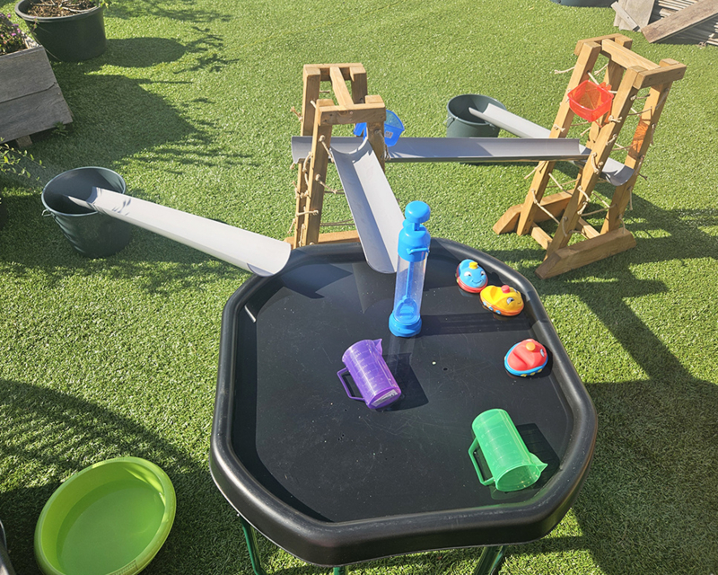 Zet de baan naast een tufftray of watertafel voor extra combinaties. Maar gewoon een emmer water erbij werkt ook prima.
