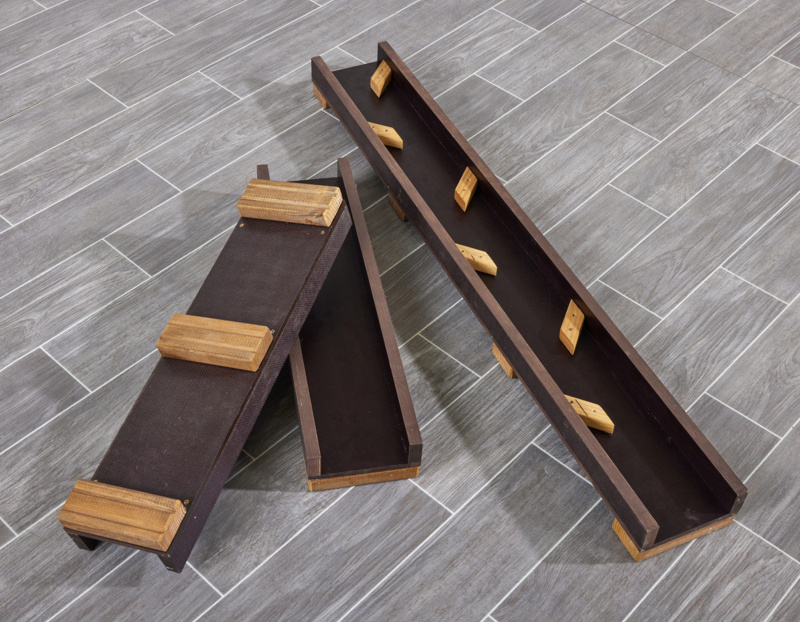 OverzichtSet van 3 houten banen waar je dingen af kan laten rollen of glijden.